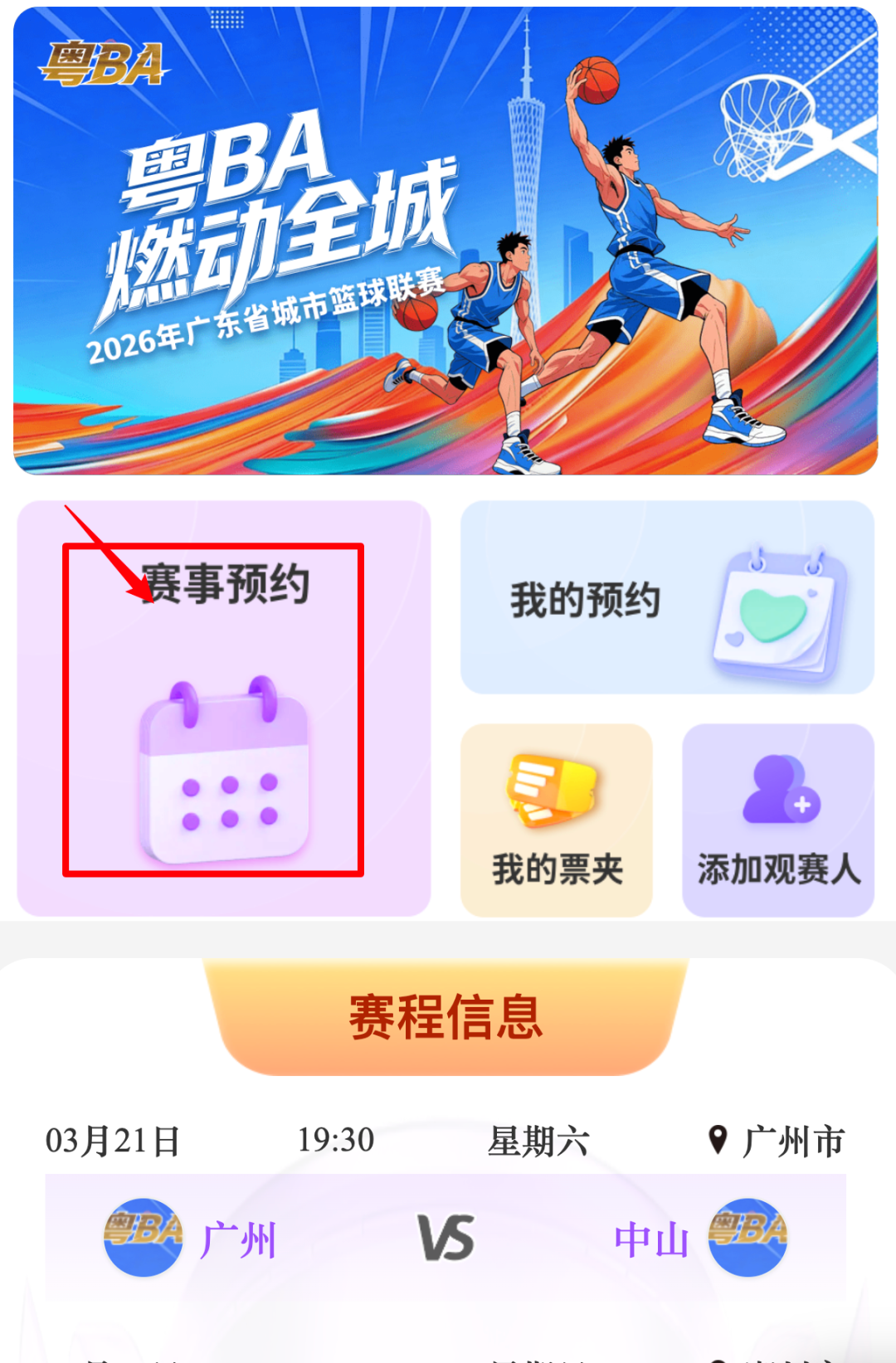 1、前往现场观赛的球迷朋友可以关注“广东篮球-粤BA”公众号,被窝电影院点击主页“粤BA购票”专栏,进入票务系统预约。
