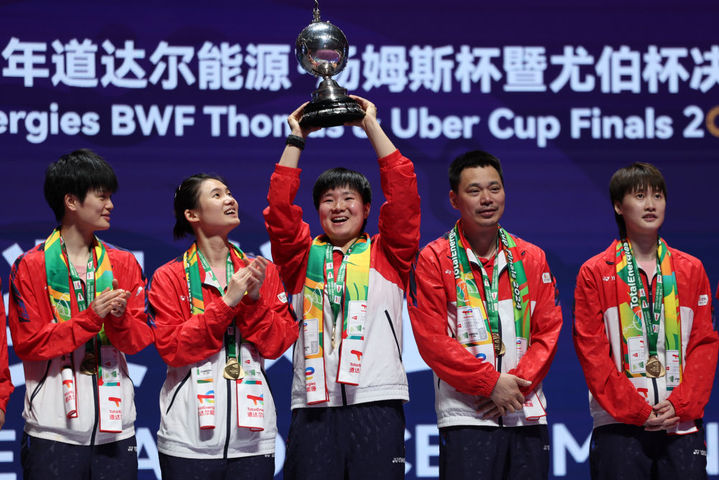 5月5日,中国队选手何冰娇(中)在颁奖仪式上高举尤伯杯奖杯。新华社记者 陈斌 摄