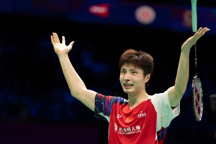 5月5日,中国队选手石宇奇在2024年汤姆斯杯羽毛球团体赛决赛中。新华社记者 江宏景 摄