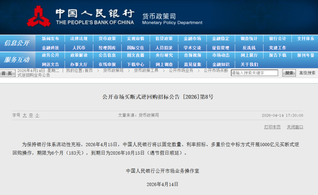 4月14日,央行发布公告称,为保持银行体系流动性充裕,2026年4月15日,中国人民银行将以固定数量、利率招标、多重价位中标方式开展5000亿元买断式逆回购操作,期限为6个月(183天),5060到期日为2026年10月15日(遇节假日顺延)。
